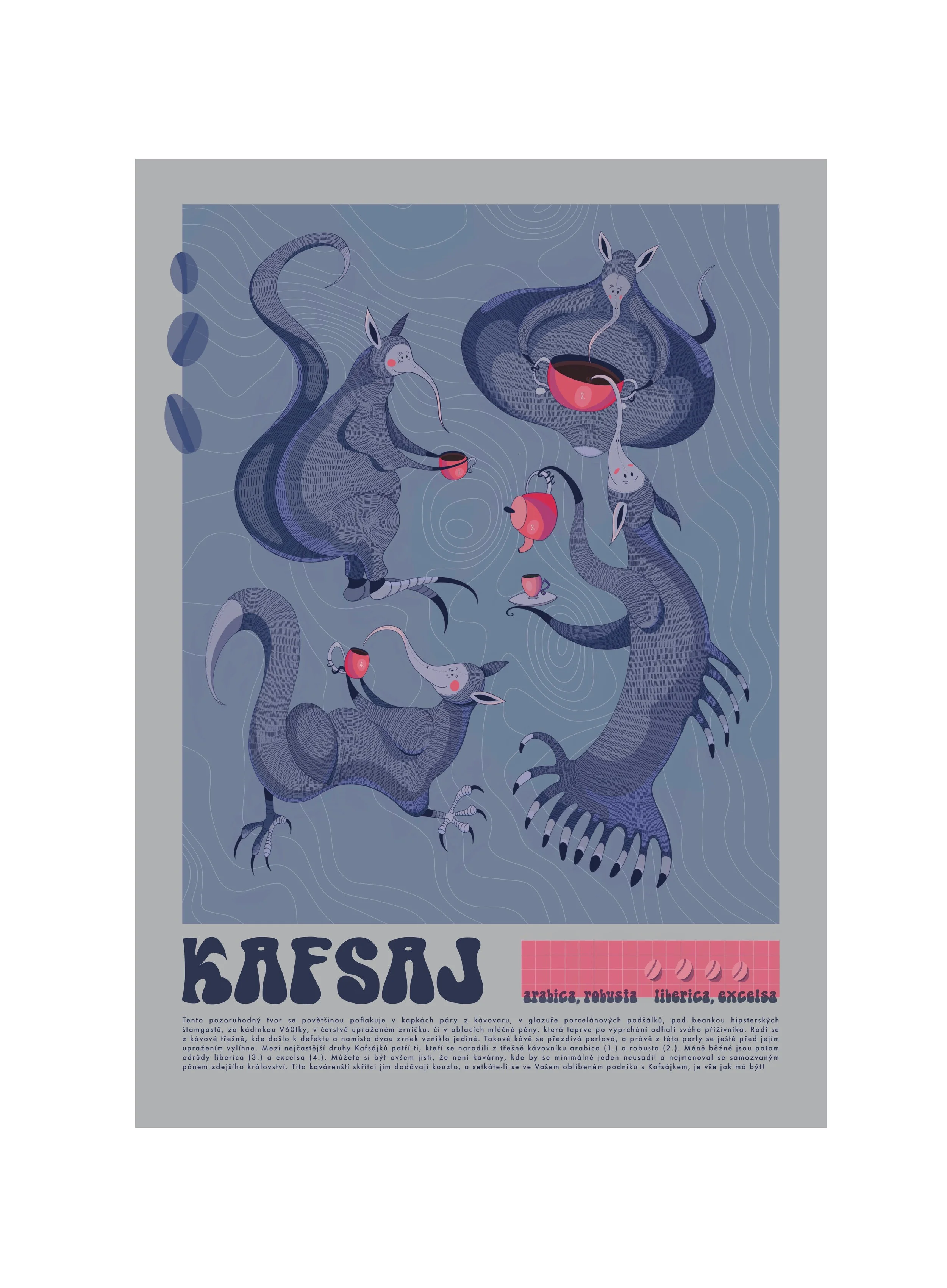 Tento pozoruhodný tvor se povětšinou poflakuje v kapkách páry z kávovaru, v glazuře porcelánových podšálků, pod beankou hipsterských štamgastů, za kádinkou V60tky, v čerstvě upraženém zrníčku, či v oblacích mléčné pěny, která teprve po vyprchání odhalí svého příživníka. Rodí se z kávové třešně, kde došlo k defektu a namísto dvou zrnek vzniklo jediné. Takové kávě se přezdívá perlová, a právě z této perly se ještě před jejím upražením vylíhne. Mezi nejčastější druhy Kafsájků patří ti, kteří se narodili z třešně kávovníku arabica (1.) a robusta (2.). Méně běžné jsou potom odrůdy liberica (3.) a excelsa (4.). Můžete si být ovšem jisti, že není kavárny, kde by se minimálně jeden neusadil a nejmenoval se samozvaným pánem zdejšího království. Tito kavárenští skřítci jim dodávají kouzlo, a setkáte-li se ve Vašem oblíbeném podniku s Kafsájkem, je vše jak má být!